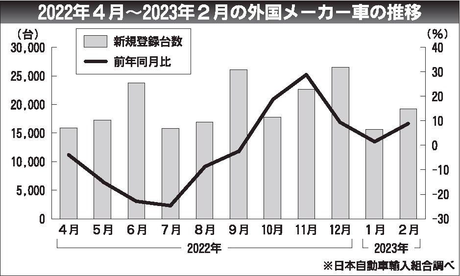 2022年度(22年4月~23年3月)の輸入車市場は、4年連続の前年割れで着地する見通しが濃厚になった。日本自動車輸入組合(JAIA、上野金太郎理事長)によると、23年2月までの外国メーカー車の新規登録台数は前年同期比2・8%減の21万7...