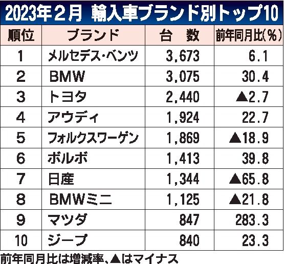 日本自動車輸入組合(JAIA、上野金太郎理事長)が6日発表した2023年2月の外国メーカー車新規登録台数は、前年同月比8.9%増の1万9209台で5カ月連続のプラスとなった。輸入車の供給改善が進み、増加幅が前月より7.5ポイント拡大した。登録車全体に占める外国メーカー車のシェアは7.1%だった。