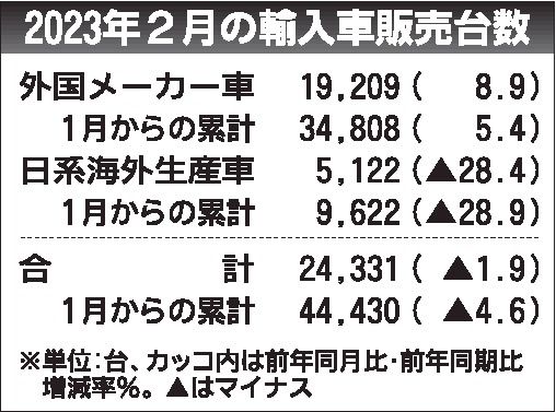 輸入車全体は同1.9%減の2万4331台で2カ月連続の前年割れ。国内メーカーの海外生産車が同28.4%減の5122台に落ち込んだことが響いた。