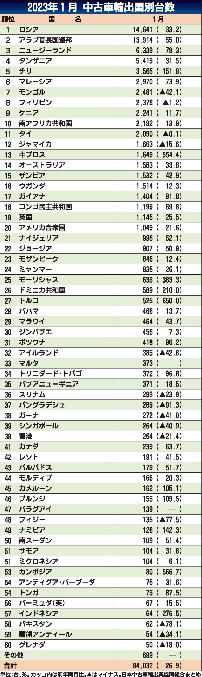 日本中古車輸出業協同組合(JUMVEA、佐藤博理事長)がまとめた2023年1月の中古車輸出台数(車両価格20万円以上)は、前年同月比26・9%増の8万4032台と4カ月連続で増加した。仕向け地別では、日本と海外メーカーの新車生産撤退と輸出...