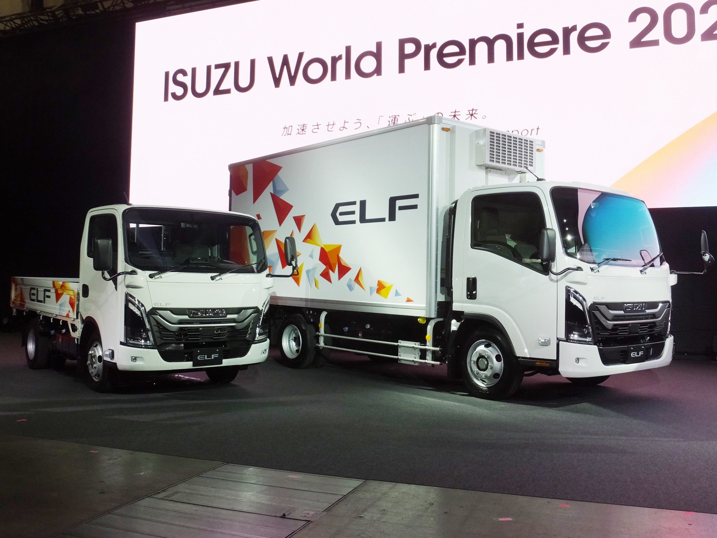 いすゞ自動車は3月7日、小型トラック「エルフ」と中型トラック「フォワード」をフルモデルチェンジして発表した。エルフは同日発売、フォワードは2023年夏頃の発売を予定する。フルモデルチェンジはエルフが17年ぶり、フォワードは16年ぶりとなる。エルフには同社初の量産電気自動車(EV)「エルフEV」を設定した。内外装デザインを全面刷新するとともに、9速デュアルクラッチトランスミッション(DCT)を設定。国内小型トラック初となる右左折時のプリクラッシュブレーキや、全車速対応のアダプティブクルーズコントロール(ACC)、レーンキープアシストなどを採用するなど、安全性能を大幅に強化した。国内販売目標はエルフシリーズ全体で年間4万台とする。