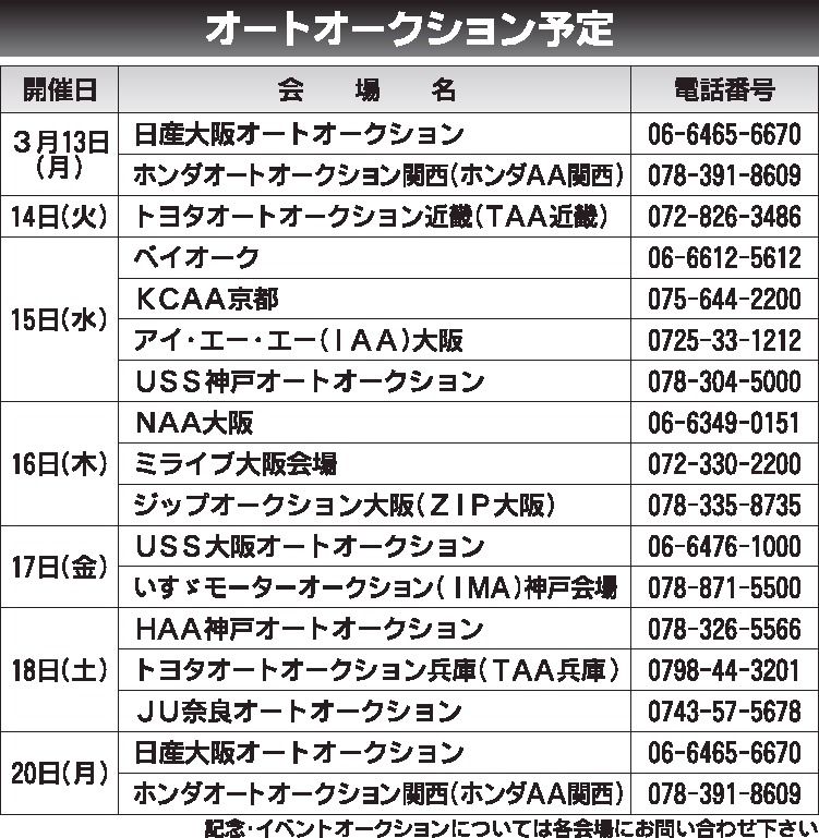〈オートオークション予定〉近畿地区 2023/3/13~20