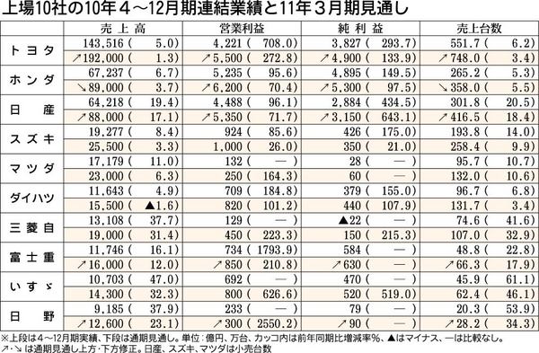 自動車メーカー10社の2010年4~12月期連結決算は、国内外で販売台数が増加し全社が増収、三菱自動車を除く9社が最終増益を確保した。急激な円高という逆風があったものの、新興国を中心に台数が増加し大幅な利益増につながった。収益体質は着実に...