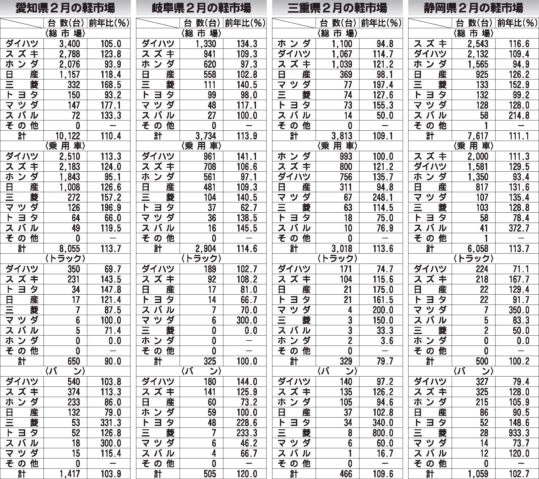 〈中部4県2023年2月の軽市場〉愛知県/岐阜県/三重県/静岡県