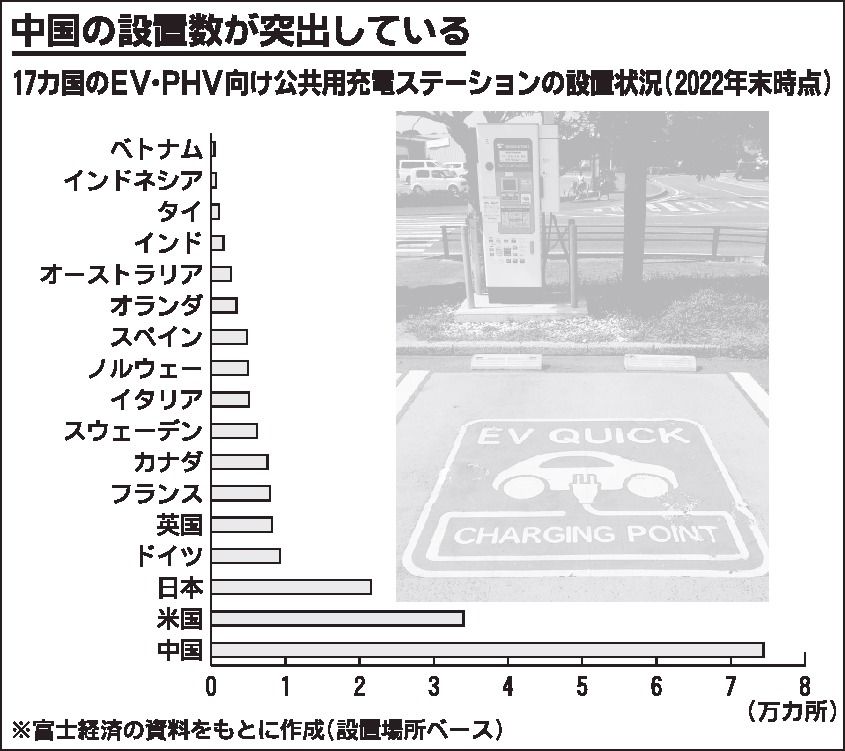 富士経済(菊地弘幸社長、東京都中央区)は、欧米やアジアなど主要17カ国の電気自動車(EV)やプラグインハイブリッド車(PHV)向け充電インフラに関する調査結果をまとめた。2022年末の充電ステーションの設置数は、中国が最多で約7万5千カ所...