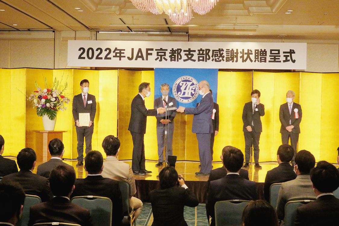 【京都】日本自動車連盟(JAF)京都支部(奥田俊彦支部長)は、京都市中京区のホテルで「感謝状贈呈式」を開催した=写真。会員獲得に貢献した販売店と社員への感謝状贈呈や懇親会を行った。コロナ禍で中断していたため、催しは4年ぶり。 3日の感謝状...