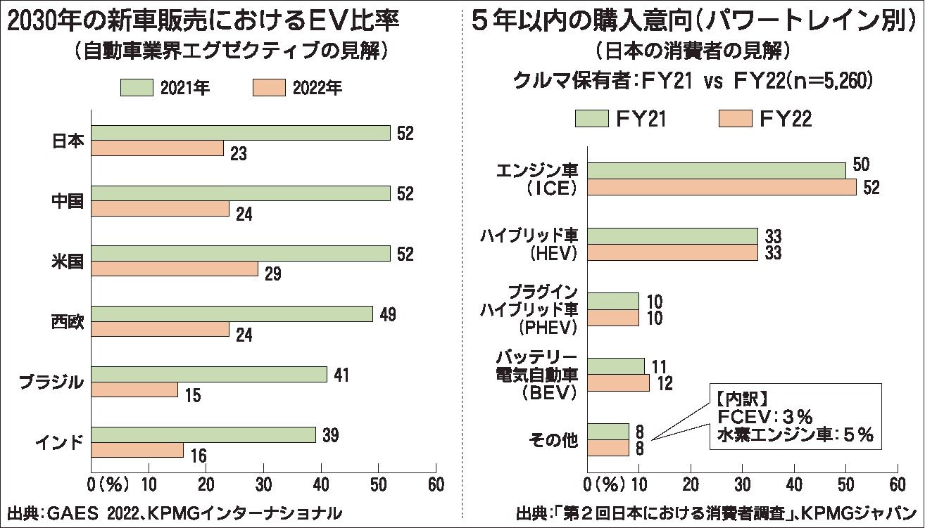 将来の電気自動車(EV)市場の見通しで、業界関係者の見方が変わり始めている。KPMGジャパン(山田裕行共同チェアマン、東京都千代田区)が公表した①「KPMGグローバル自動車業界調査2022」と②「日本における消費者調査」によると、自動車業...