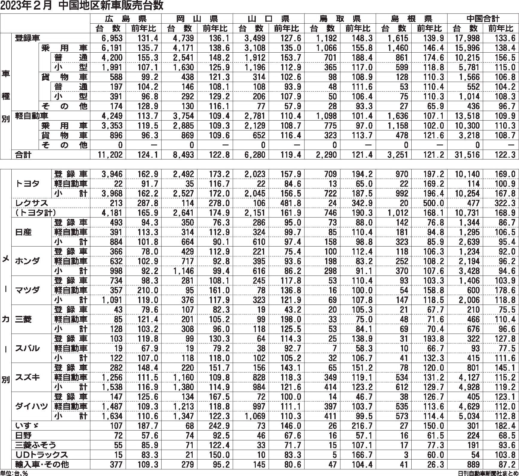 1月の中国地区総新車販売台数は、前年同月比22・3%増の3万1516台で、6カ月連続の増加となった。登録車は前年同月を3割強、軽自動車は前年同月を1割弱と揃って上回る結果となった。このうち登録車は前年同月比33・6%増の1万7998台。軽...