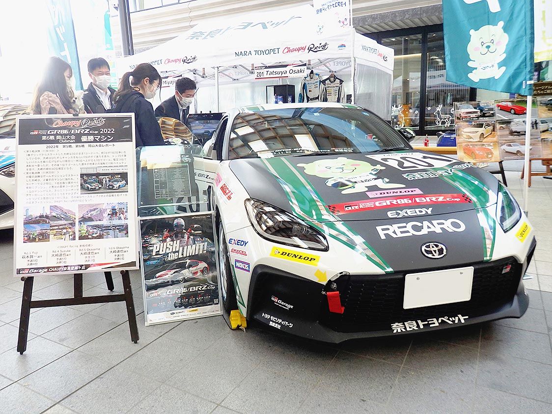 トヨタユナイテッド奈良(菊池武之祐社長)が、モビリティイベントに「GR86/BRZカップ2022 クラブマンシリーズ」第6戦の優勝マシン=写真=を展示した。同社のレースチーム「チャウピーレーシング」を念願の初優勝に導いた車両に多くの来場者...