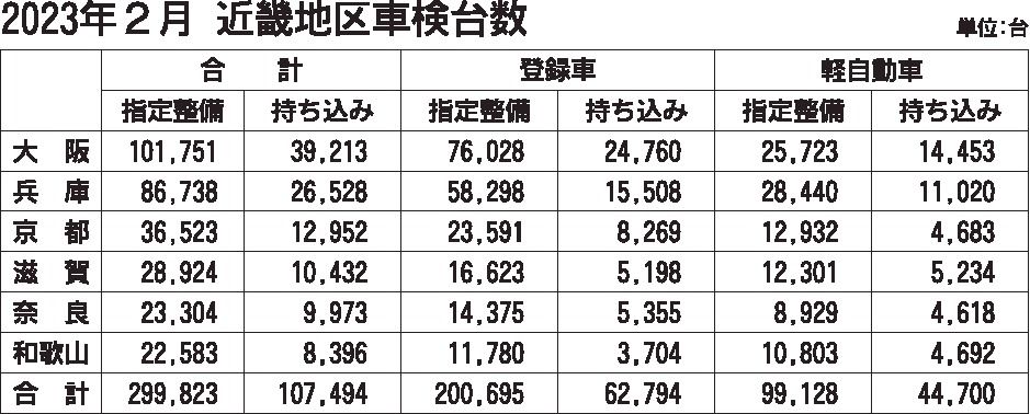 近畿2府4県の2023年2月の継続検査(車検)台数(軽自動車を含む)は、前年同月比7・3%増の40万7317台で、7カ月連続の前年超えとなった。登録車は同8・2%増の26万3489台で7カ月連続のプラス、軽は同5・7%増の14万3828台...