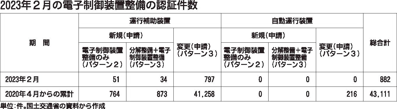 国交省、2023年2月の電子制御装置整備の認証件数は882件