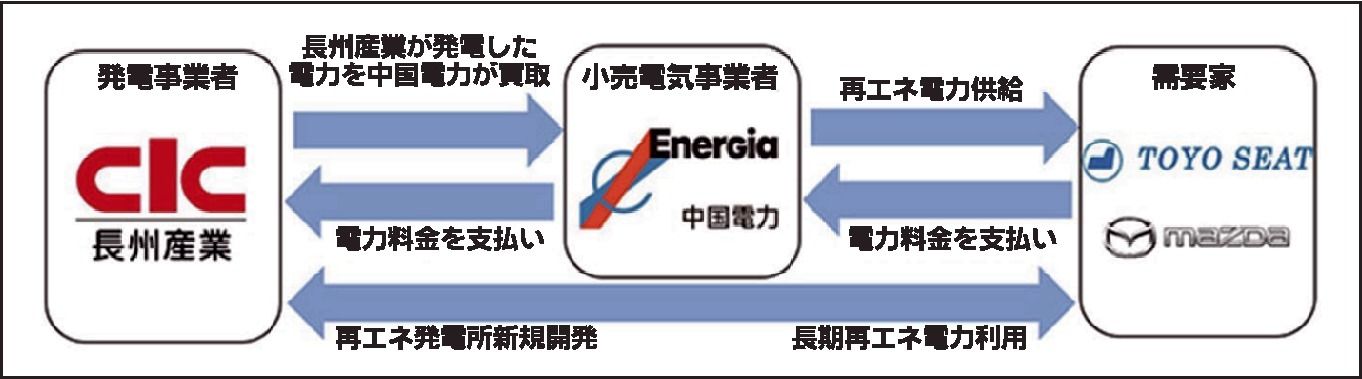 コーポレートPPAは、企業が小売り電気事業者や発電事業者と長期契約を結び、再エネを固定価格で購入できる仕組み。このうちオフサイト方式は、電力の消費場所から離れたところに発電設備を設ける方式のことを指す。複数の需要家によるオフサイトコーポレートPPAの運用を始めるのは中国地域で初めて。
