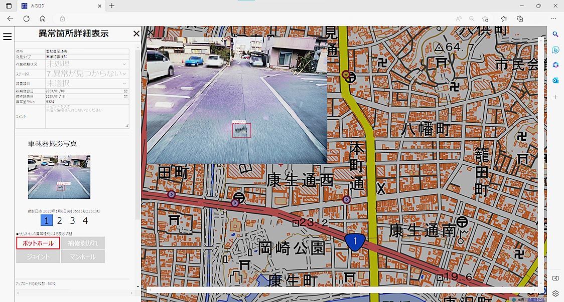 本格的に運用を開始するみちろぐ2.0では、これまでクラウド上で行っていたAI画像認識に加え、端末や近くのサーバーで情報を処理する「エッジコンピューティング」を用い、異常の検知をより高い精度で行えるようにした。路面の平坦性を示す指標「IRI」とひび割れ率を割り出し、地図上で損傷状況を色分け表示する機能も新たに搭載した。