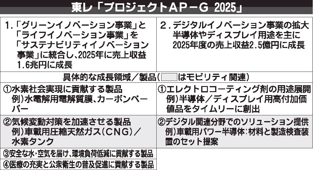 東レは、2025年度を最終年度とする中期経営計画を発表した。同年度の売上収益2兆8千億円、事業利益1800億円を目指し、車載用水素タンクに用いる炭素繊維やパワー半導体関連製品などを成長分野と位置づける。一方、電気自動車(EV)用バッテリー...