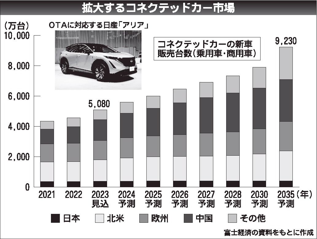 富士経済(菊地弘幸社長、東京都中央区)は、「コネクテッドカー」に関する市場調査結果をまとめた。2035年には乗用・商用を合わせたコネクテッドカーの新車販売台数が9230万台(22年比2倍)に達する見通しで、自動車メーカーやティア1(一次部...