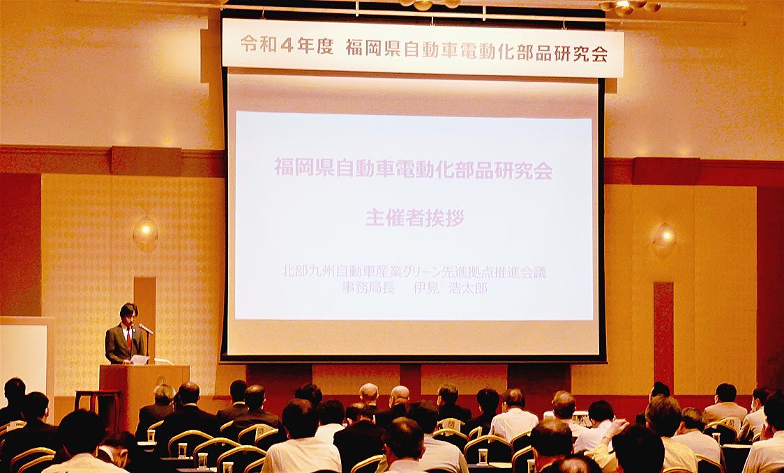 【福岡】北部九州自動車産業グリーン先進拠点推進会議(服部誠太郎会長=福岡県知事)は、福岡市中央区で「令和4年度 福岡県自動車電動化部品研究会」を開催した=写真。自動車の電動化に関連したビジネスへの参入を検討する地元企業に、電動化技術の開発...
