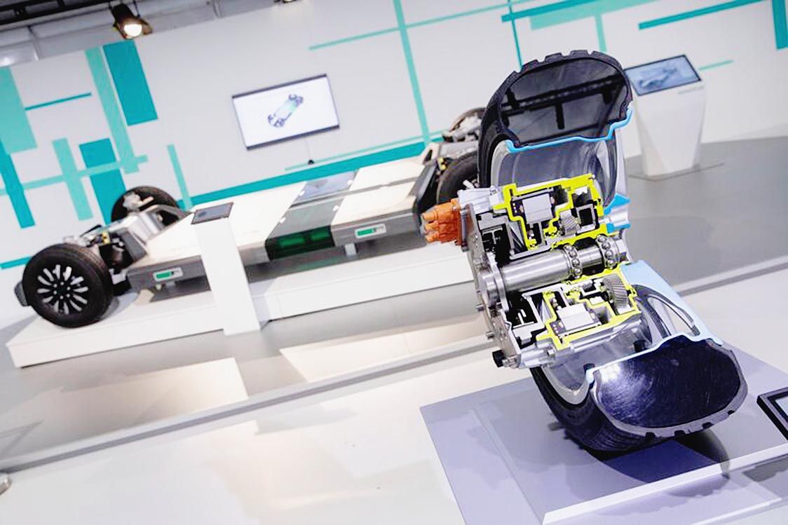 リム径14インチのホイール内で、モーターとギアボックス、機械式摩擦ブレーキをホイールベアリング周辺に配置した。モーター出力は定格7~26キロワット、ピーク値(最大瞬間電流)60キロワットで、モーターのトルクをギアボックスを介して直接ホイールに伝達する。4輪をそれぞれ制御することで坂道や雪道でも安定して走行できるという。