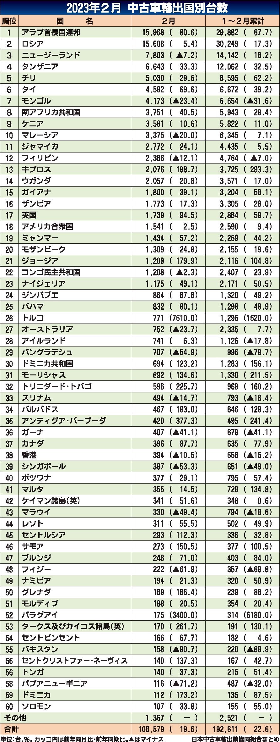 日本中古車輸出業協同組合(JUMVEA、佐藤博理事長)がまとめた2023年2月の中古車輸出台数(車両価格20万円以上)は、前年同月比19・6%増の10万8579台と5カ月連続で増加した。仕向け地別では、アラブ首長国連邦(UAE)が前年同月...