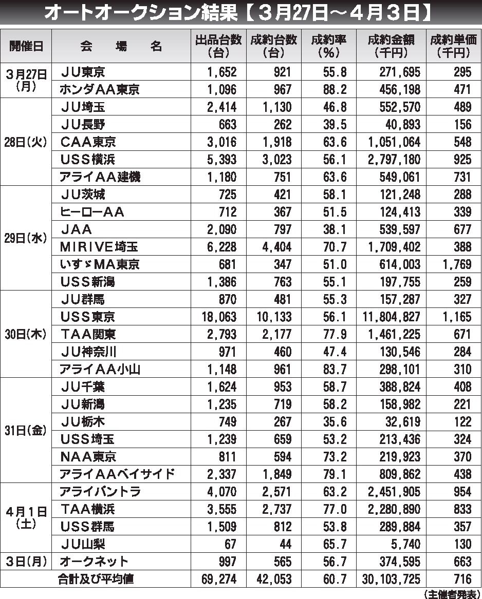 〈オートオークション結果〉首都圏 2023/3/27~4/3