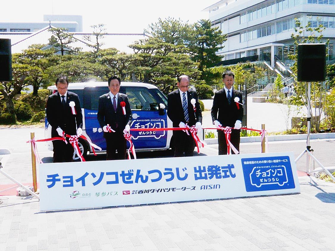 【高松】善通寺市(辻村修市長)は、アイシン、香川ダイハツモータース、琴参バスの3社と共同したAI(人工知能)デマンド型交通システム「チョイソコ」の実験運行出発式を同市役所前で開催した=写真。トヨタグループのアイシンが開発・運営する同サービ...