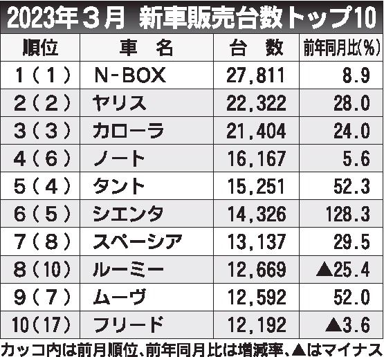 23年3月の総合ランキングでは、エヌボックスが7カ月連続の首位を獲得した。上位10車種中8車種が前年を上回り、新車不足の解消が進んだ格好だ。