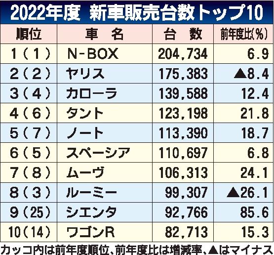 2022年度(22年4月~23年3月)の車名別新車販売台数(登録車と軽自動車の合計)で、ホンダ「N―BOX(エヌボックス)」が2年連続の首位に立った。単月ベースでも12カ月中、首位を9回獲得。高い人気と安定した新車供給がかみ合い、2位のトヨタ「ヤリス」に約3万台の差をつけた。上位10車種のうち、8車種が前年実績を上回った。昨年8月に全面改良されたトヨタ「シエンタ」は3年ぶりにランキング上位に入った。スズキ「ワゴンR」もスライドドア仕様車の人気により、4年ぶりにベスト10圏内に復帰した。