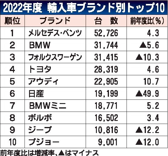 外国メーカーのブランド別ではメルセデス・ベンツが同4.3%増の5万2726台と8年連続の首位だった。BMWは同5.6%減の3万1744台ながらも順位を1つ上げて2位となり、フォルクスワーゲンは同10.3%減の3万1415台で3位だった。ルノー、ランドローバー、フェラーリ、ベントレー、アストンマーチンの5ブランドが最多台数を更新した。