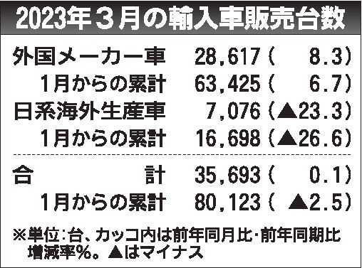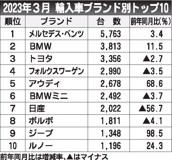 23年3月の外国メーカー車新規登録台数は、6カ月連続の増加となる前年同月比8.3%増の2万8617台だった。増加幅は前月から0.6ポイント低下した。上位ブランドではアウディが同7割増、BMWも同2桁増を記録。一方でフォルクスワーゲンとBMWミニは前年を割り込んだ。
