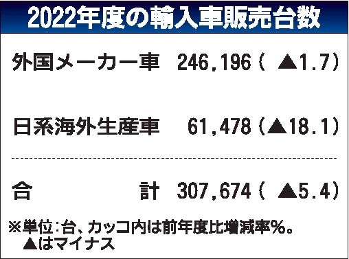 日本自動車輸入組合(JAIA、上野金太郎理事長)が6日発表した2022年度(4月~23年3月)外国メーカー車の新規登録台数は、前年度比1.7%減の24万6196台だった。国産を含む22年度の総登録台数は微増だったが、外国メーカー車は海上輸送の関係などで納期管理が難しく、供給力が完全に回復しなかった。前年度に過去最高を記録した登録車全体に占める外国車メーカー車のシェアは0.3ポイント減の9.1%だった。ただ、単月ベースの登録台数は昨年10月から前年超えが続いており、状況は好転しつつある。