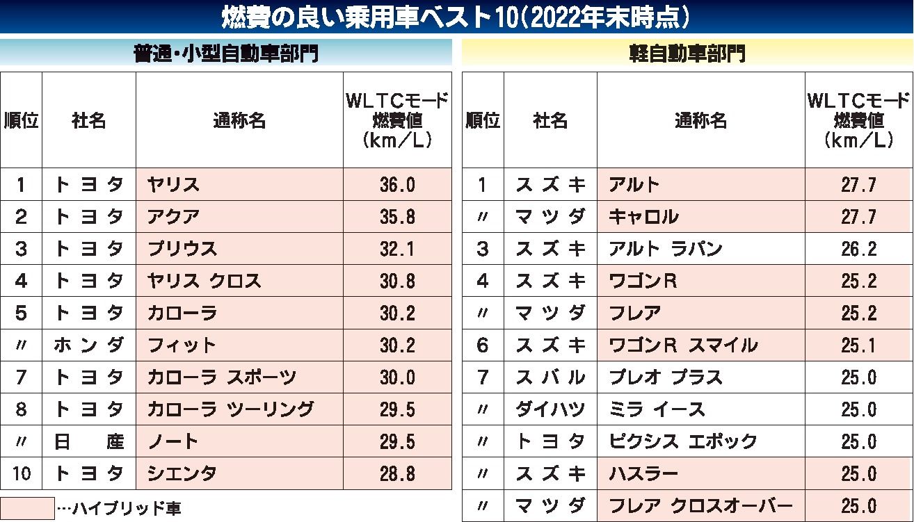 国土交通省は、乗用車の燃費ランキング(2022年末時点)を公表した。普通・小型自動車部門ではトヨタ自動車「ヤリス」が、軽自動車部門ではスズキ「アルト」とマツダ「キャロル」が、それぞれ3年連続で首位となった。 ヤリスは、ハイブリッド車(HV...
