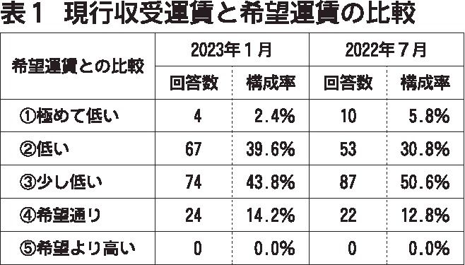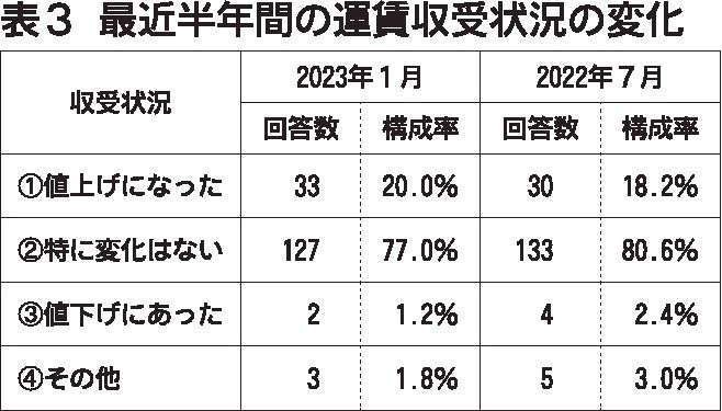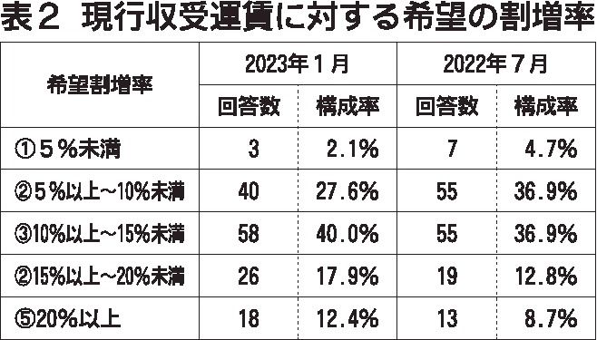 東京都トラック運送事業協同組合連合会(東ト協連、石川和夫会長)は、会員事業者を対象に1月末に実施した第38回「運賃動向に関するアンケート調査結果」を公表した。希望料金に対する収受運賃が「希望通り」とした回答は前回調査(2022年7月)に対...