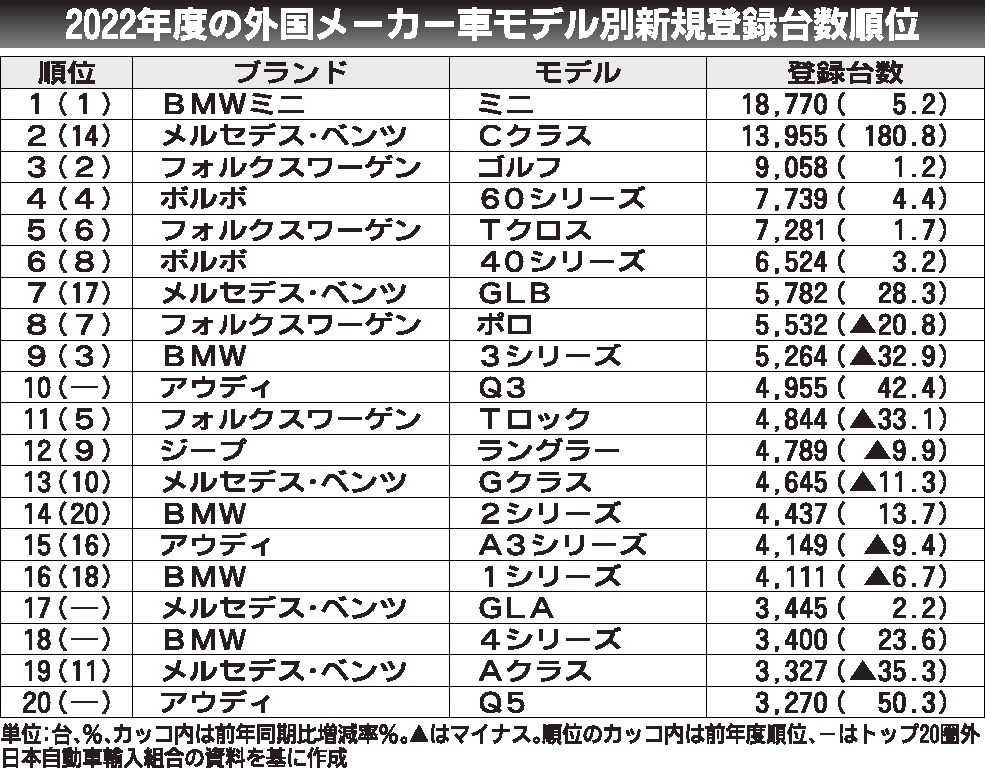 2022年度外国メーカー車モデル別販売ランキング、SUVが上位にずらり セグメントを問わず販売の主軸に