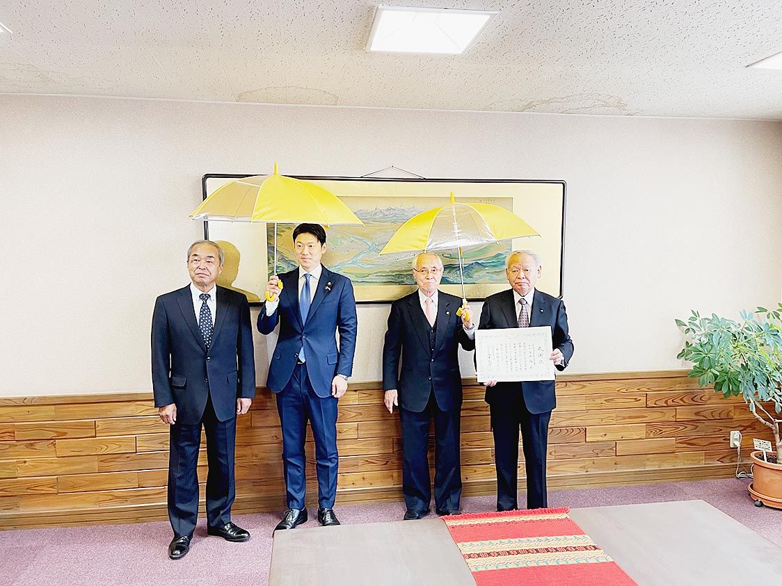 〇…旭川地方自家用自動車協会( ■(吉の士が土) 田裕会長)は、2023年の小学校新入学児童用として旭川市に反射材付き学童黄傘1500本を寄贈した。吉田会長と今津寛介旭川市長が報道陣に黄色い傘をさしてピーアールした。 〇… ■(吉の士が土...
