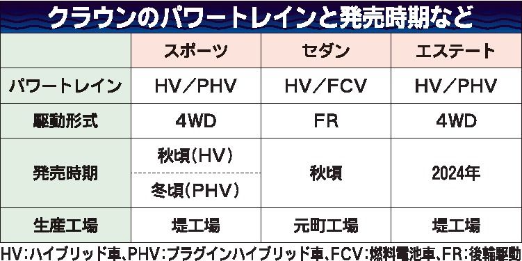 3モデルの車両寸法も公開した。セダンは歴代クラウンで初めて全長が5メートルを超える。駆動形式はスポーツとエステートが四輪駆動、セダンが後輪駆動(FR)。パワートレインは発売済みの「クロスオーバー」も含め、すべて電動車となる。スポーツの発売時期は一部販売店に8月と伝えていたが、HVが今秋、PHVが今冬となる。
