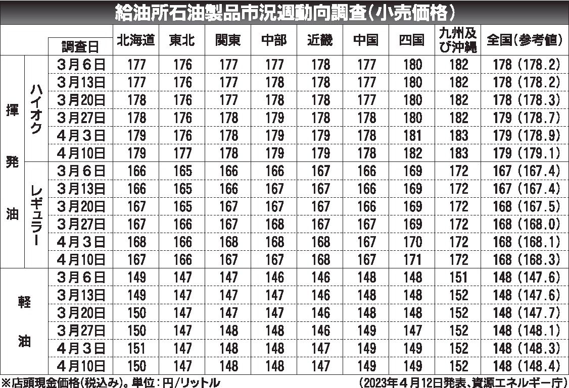 〈給油所石油製品市況週動向調査(小売価格)〉2023/3/6~4/10