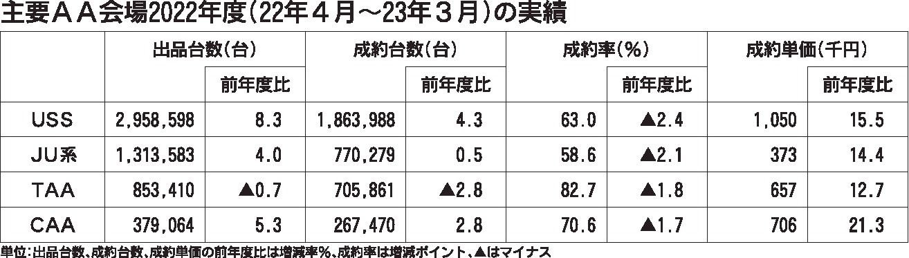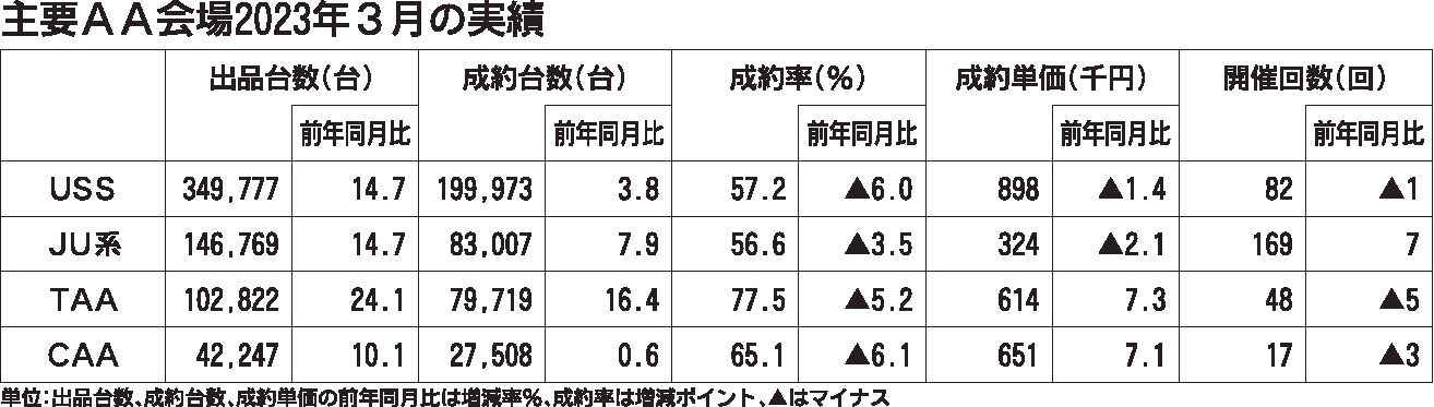主要中古車オークション(AA)の3月の状況は、出品台数、成約台数ともに前年同月を上回る好調ぶりを見せた。主要4AAの出品台数は、前年同月と比べて2桁増で推移した。新車販売台数の増加に伴う下取り車の流通が増えたことが主な要因に挙げられる。一...