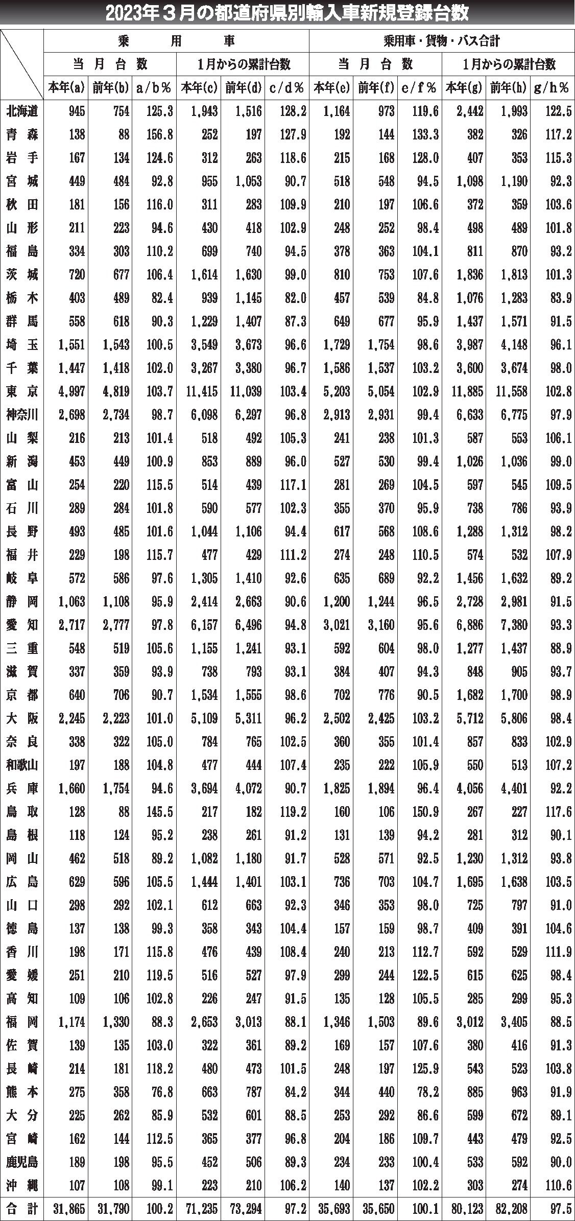 〈2023年3月の都道府県別輸入車新規登録台数〉