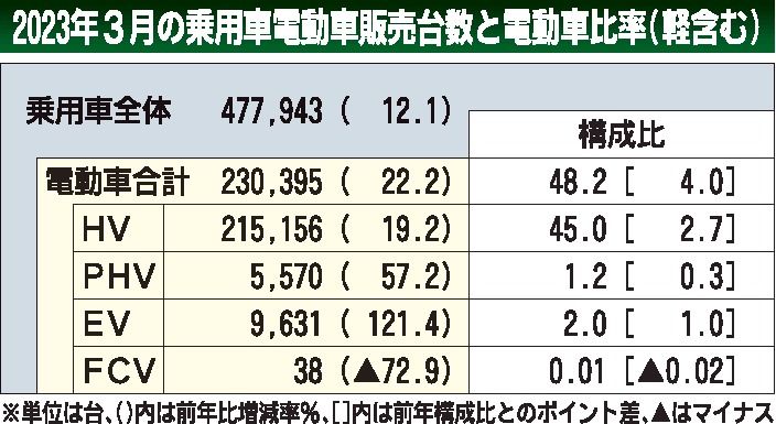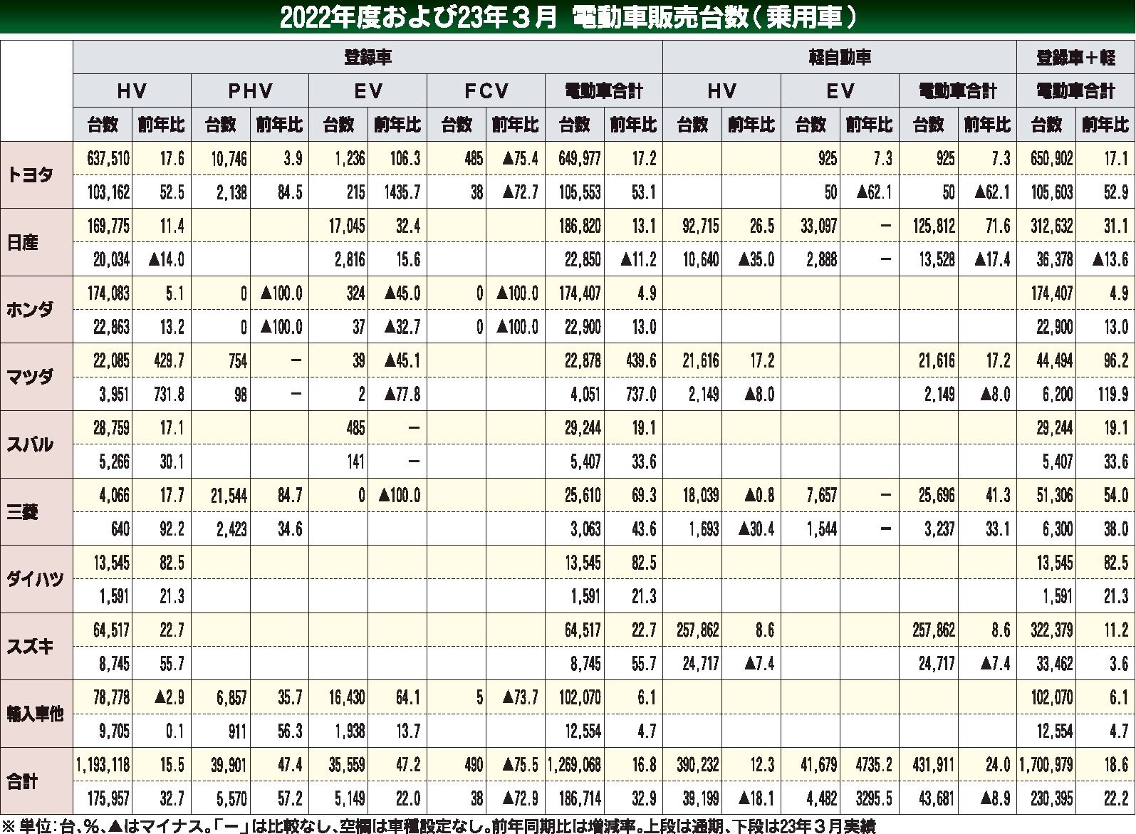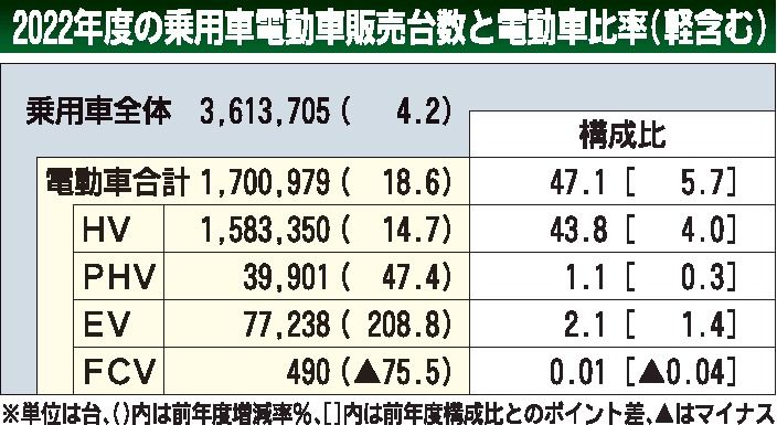 2022年度の国内乗用車市場に占める電動車(登録車と軽自動車の合計)の比率は、前年度から5・7㌽増えて47・1%となり、年度ベースで過去最高を更新した。けん引役はハイブリッド車(HV)だが、電気自動車(EV)も軽規格車の販売が4万台を超え...