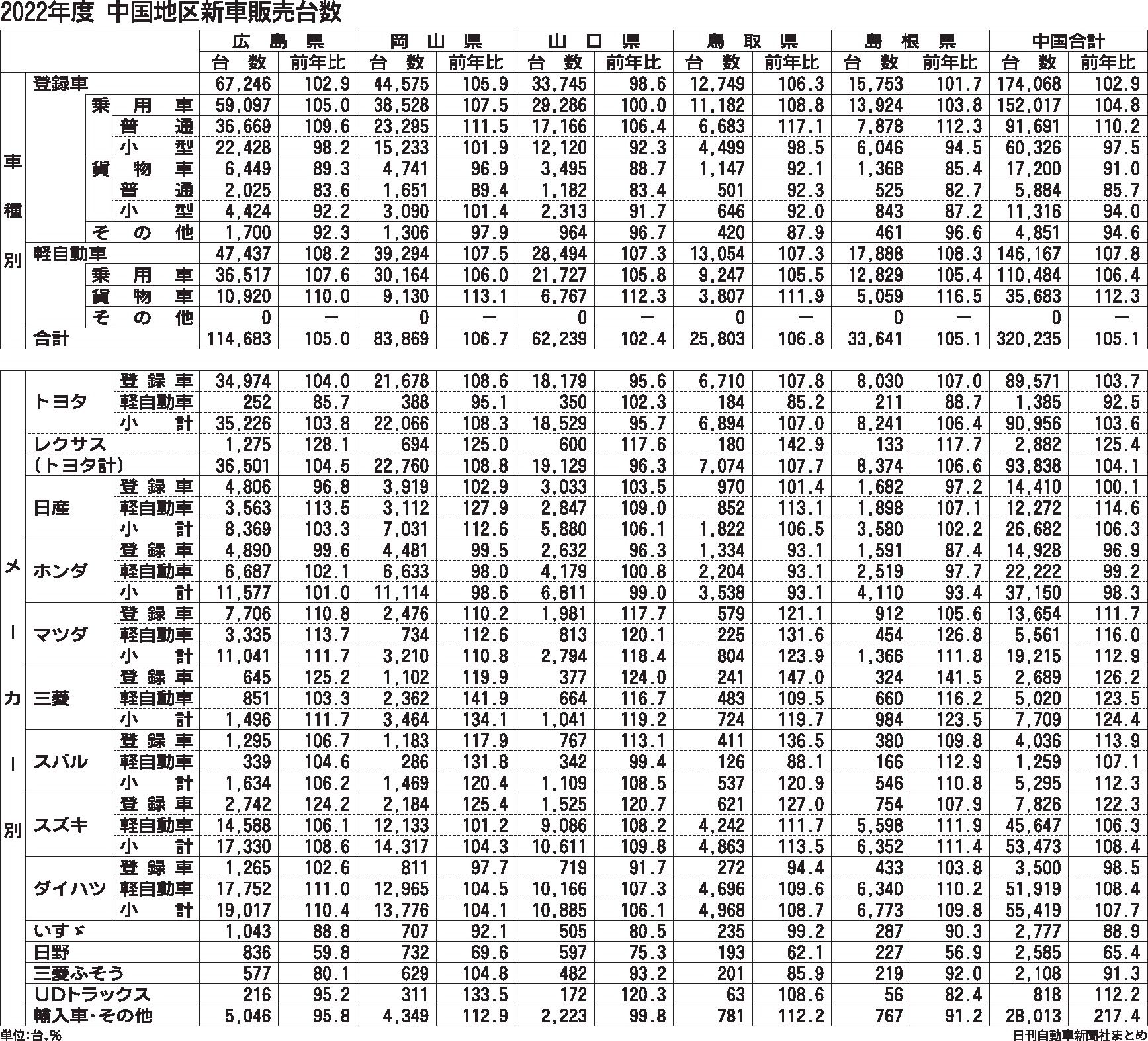 2022年度(22年4月~23年3月)の中国地区の新車販売台数(登録車と軽自動車の合計)は、前年度比5・1%増の32万235台となった。22年秋頃から、半導体不足や新型コロナウイルスの感染拡大の影響で制約されていた自動車メーカー各社の新車...
