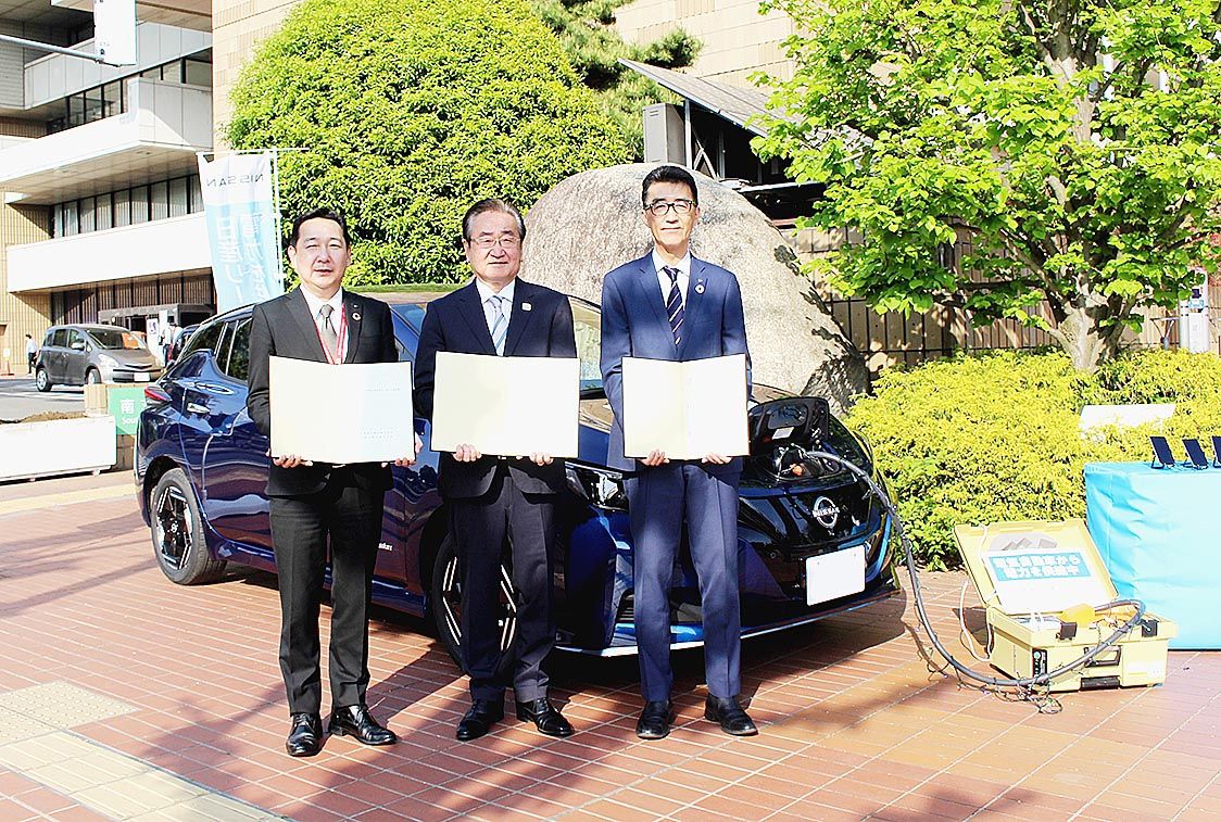 日産自動車と日産東京販売(菊地文夫社長)は、八王子市(石森孝志市長)と電気自動車(EV)を活用した災害時における連携協定を締結した。協定締結に伴い、八王子市役所本庁舎前で「リーフ」を展示し、家電製品への給電デモンストレーションを行った=写...