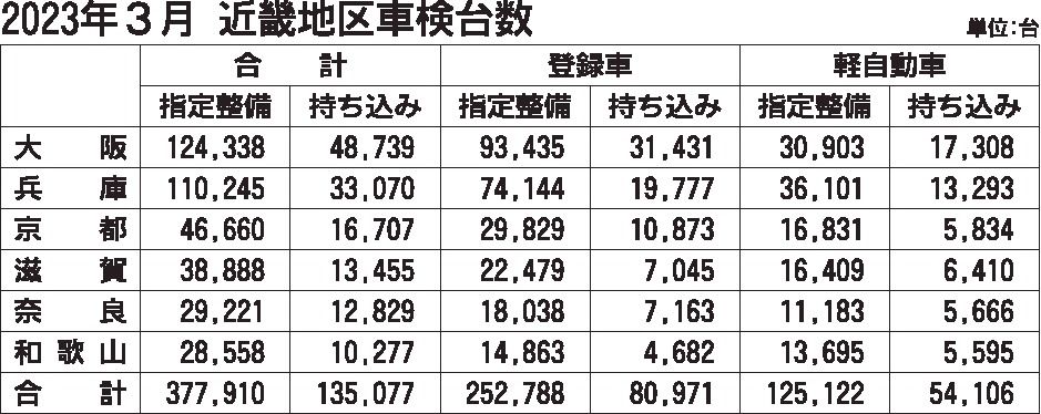 近畿2府4県の2023年3月の継続検査(車検)台数(軽自動車を含む)は、前年同月比5・5%増の51万2987台で、8カ月連続の前年超えだった。登録車は同6・4%増の33万3759台で8カ月連続のプラス、軽は同3・9%増の17万9228台と...
