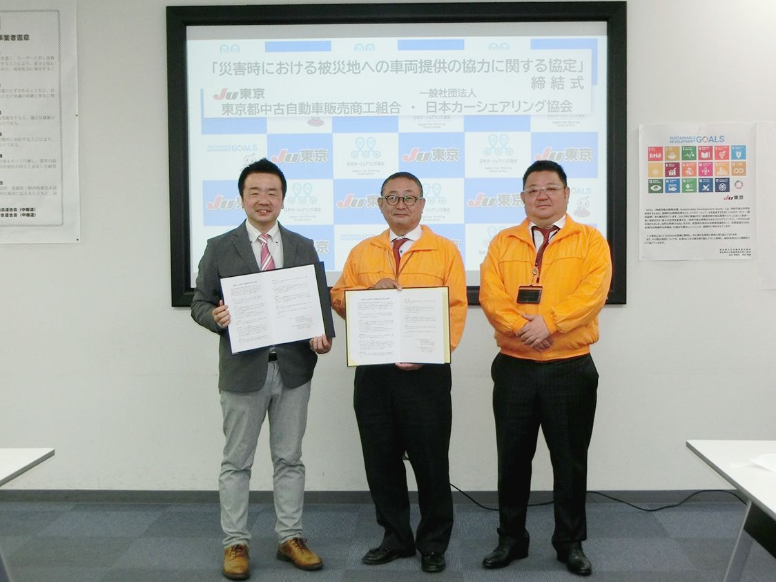 東京都中古自動車販売協会・同商工組合(JU東京、萩田典雄会長・理事長)は、日本カーシェアリング協会(吉澤武彦代表理事)と「災害時における被災地への車両提供の協力に関する協定」を締結した=写真。災害時に車が被災した人への支援を円滑に進めるた...