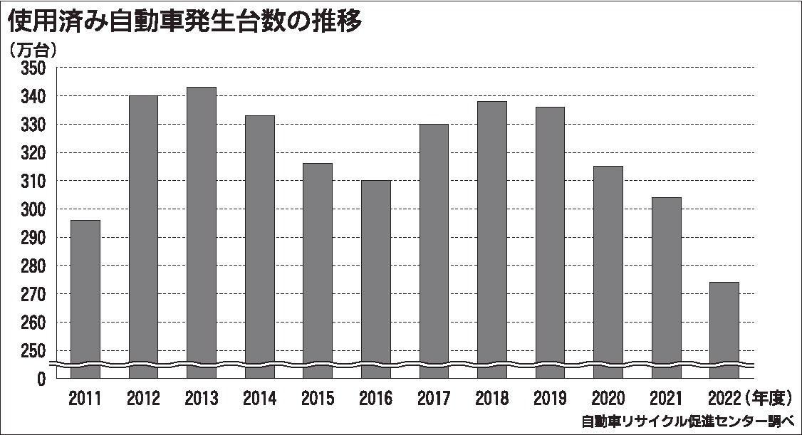 使用済み自動車の発生台数減少が止まらない。自動車リサイクル促進センター(JARC、細田衛士理事長)が公表した国内における2022年度の使用済み自動車発生台数は、前年比10・0%減の約273万8千台だった。年度実績が分かる05年度以降、過去...