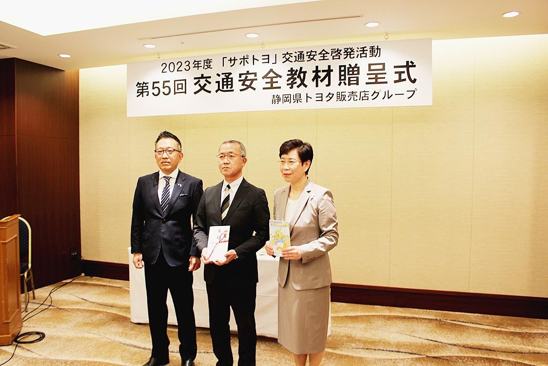【静岡】静岡県内のトヨタ系ディーラー5社とトヨタレンタリース店2社、トヨタモビリティパーツ静岡支社、トヨタL&F静岡の9社は、静岡市駿河区のホテルで「2023年度サポトヨ交通安全啓発活動 幼児交通安全教材」の贈呈式を行った=写真。毎年、春...