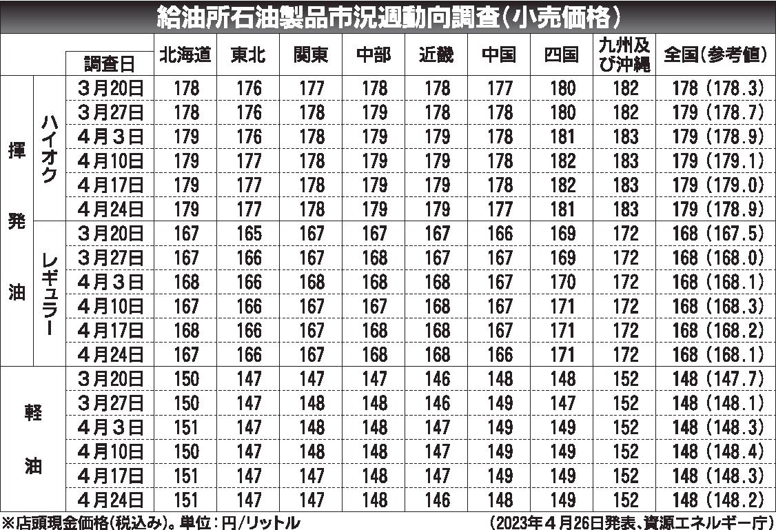 〈給油所石油製品市況週動向調査(小売価格〉2023/3/20~4/24