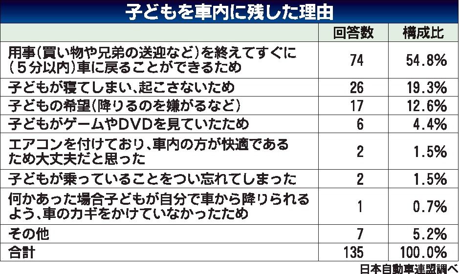 JAFの実験では外気温が23.3~24.4度の日中で、SUVの車内温度が最高46.5度まで上昇した。JAFは「密閉された車内は思いがけず高温となることがある」とし、「少しくらいだから、ぐっすり寝ているから、という子どものためを思った行動は、逆に危険にさらしかねない。油断せず、子どもを残してクルマから離れることは絶対にやめましょう」と、子どもの車内事故防止に強いメッセージを発信している。