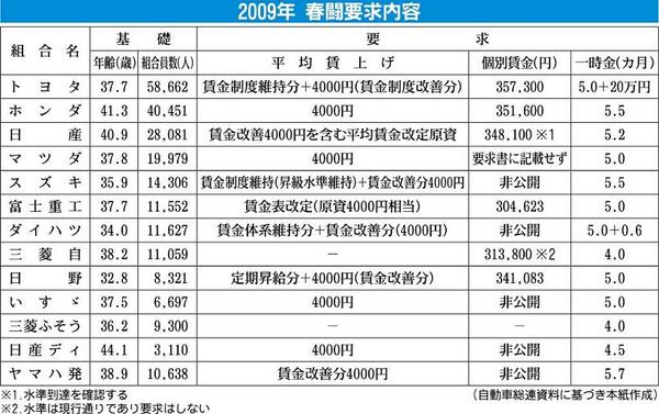 自動車メーカー各社の労働組合が18日、2009年春闘の要求を経営側に一斉提出した。全13組合のうち、11組合が賃金改善分として4千円を要求した。三菱自動車、三菱ふそうを除くすべての組合が、物価上昇などを根拠に自動車総連が設定した要求基準に...
