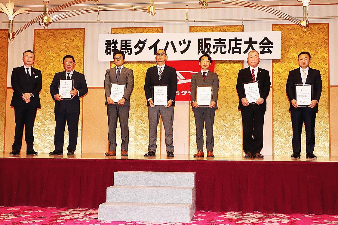 【前橋】群馬ダイハツ(佐藤順社長)は、「2023年販売店大会」を渋川市伊香保町の宿泊施設を使用して開催した。2022年1年間の新車販売台数、部品売り上げなどの各部門で優秀な成績を収めた協力販売店をダイハツ工業と群馬ダイハツで表彰した=写真...