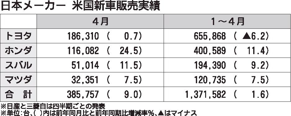 日本の自動車メーカー4社が発表した4月の米国新車販売台数は、前年同月比9・0%増の38万5757台と2カ月連続のプラスだった。半導体をはじめサプライチェーン(供給網)の混乱が解消しつつあることなどから販売が回復し、前年同月比も3月に比べ8...