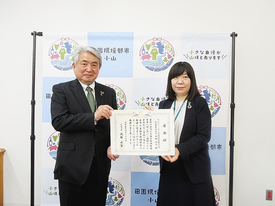 【宇都宮】あいおいニッセイ同和損害保険栃木支店(小野智康支店長)は、小山市(浅野正富市長)に「企業版ふるさと納税」を行った。4月28日に同市役所内で行われた感謝状贈呈式で同支店栃木南支社の小林里美副支社長が浅野市長から感謝状を受け取った=...